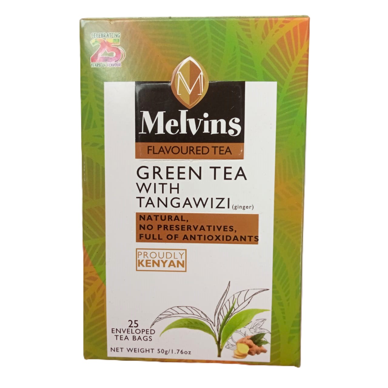 Melvins Flavoured Green Tea with Tangawizi – 25 Tea Bags: A refreshing fusion of smooth green tea and spicy ginger (tangawizi) for a natural boost of energy, digestion support and immune defense—delicious hot or iced.