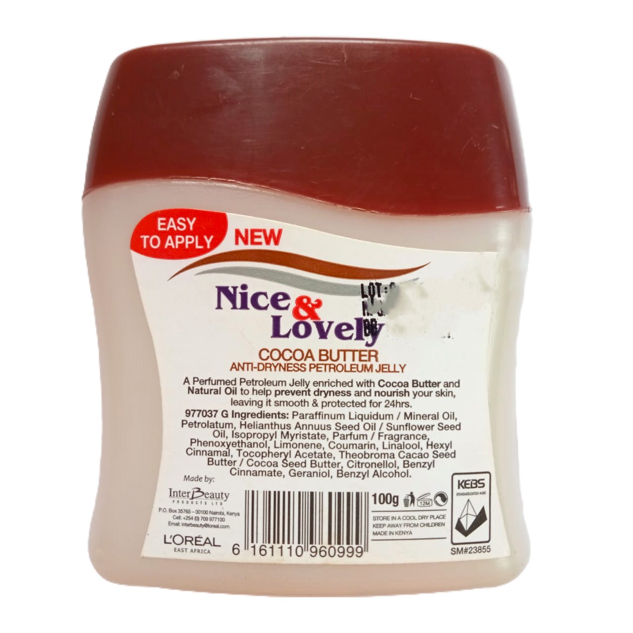 Pamper your skin with the moisture it needs using Nice & Lovely Cocoa Butter Petroleum Jelly – 100g, now available at Beeston Delight Supermarket.