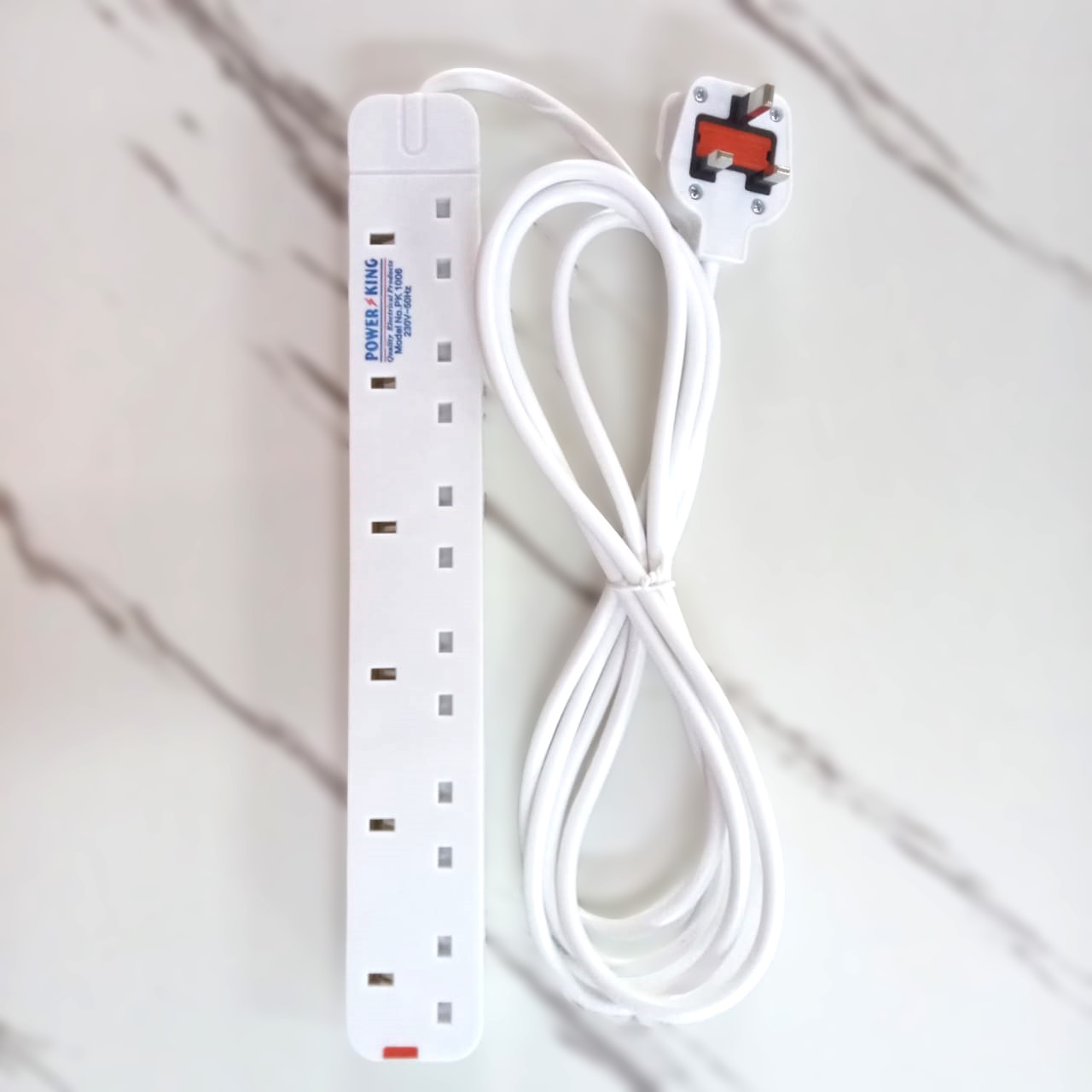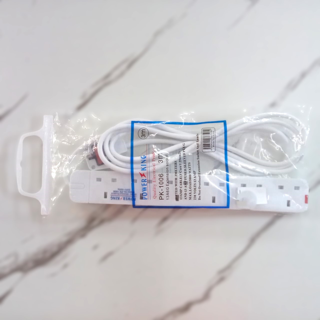Power multiple devices simultaneously with the PowerKing 6-Way Power Extension. Featuring a 3-meter cable, it offers flexibility and safety for your home or office needs. Available now at Beeston Delight Supermarket.