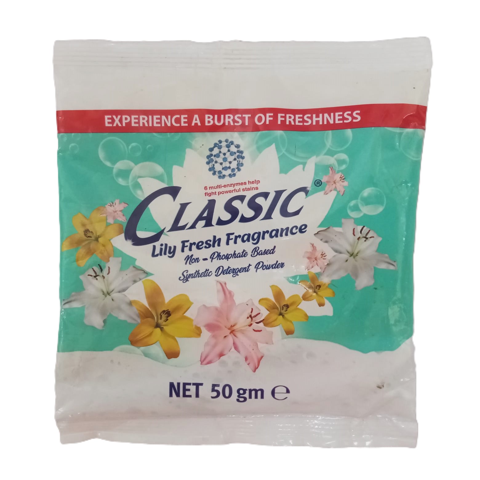 Classic Lily Fresh Detergent Powder – 50g: Cleans your clothes and leaves a soft lily scent that keeps laundry smelling fresh and floral.